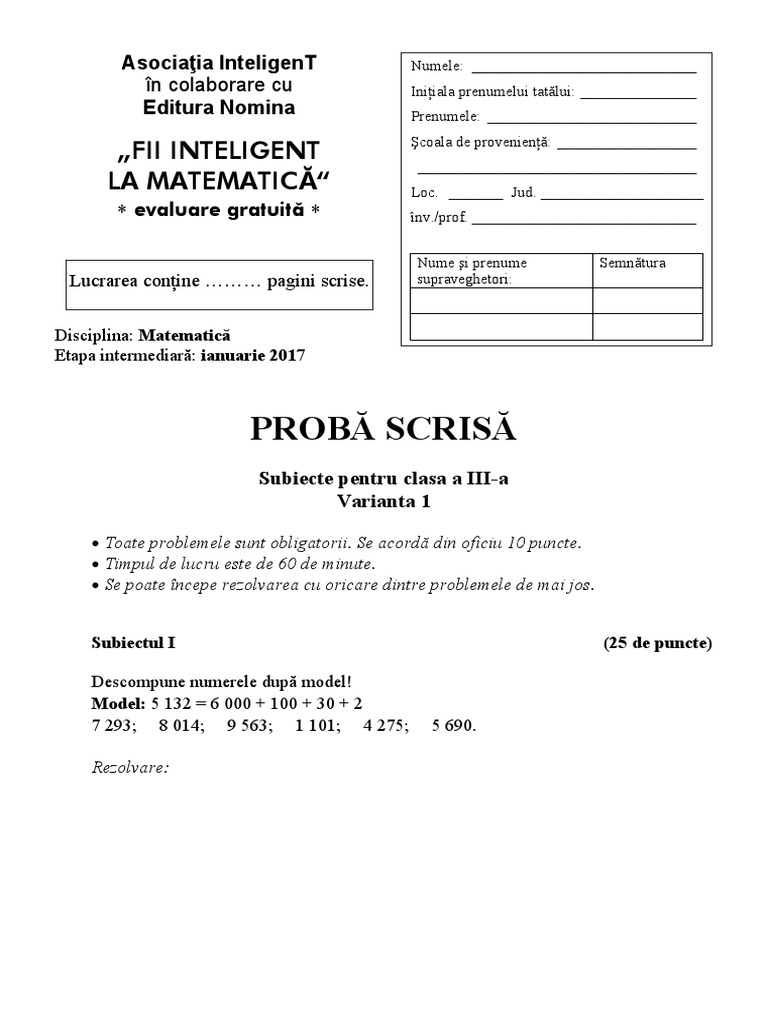 Asociaţia inteligent în colaborare cu editura nomina fii inteligent la matematică evaluare gratuită disciplina. 30 de zile retur. La matematica rts. Timpul de lucru este de 60 de minute.