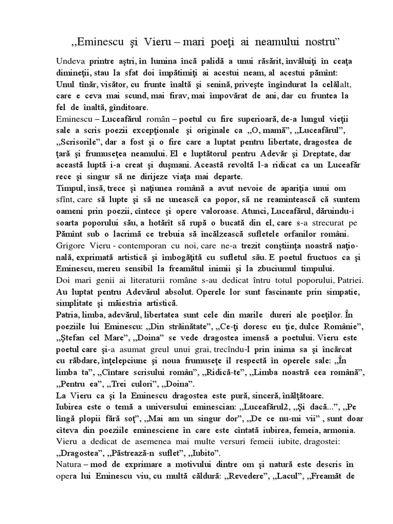 Eminescu Si Vieru Mari Poeţi Ai Neamului Nostru