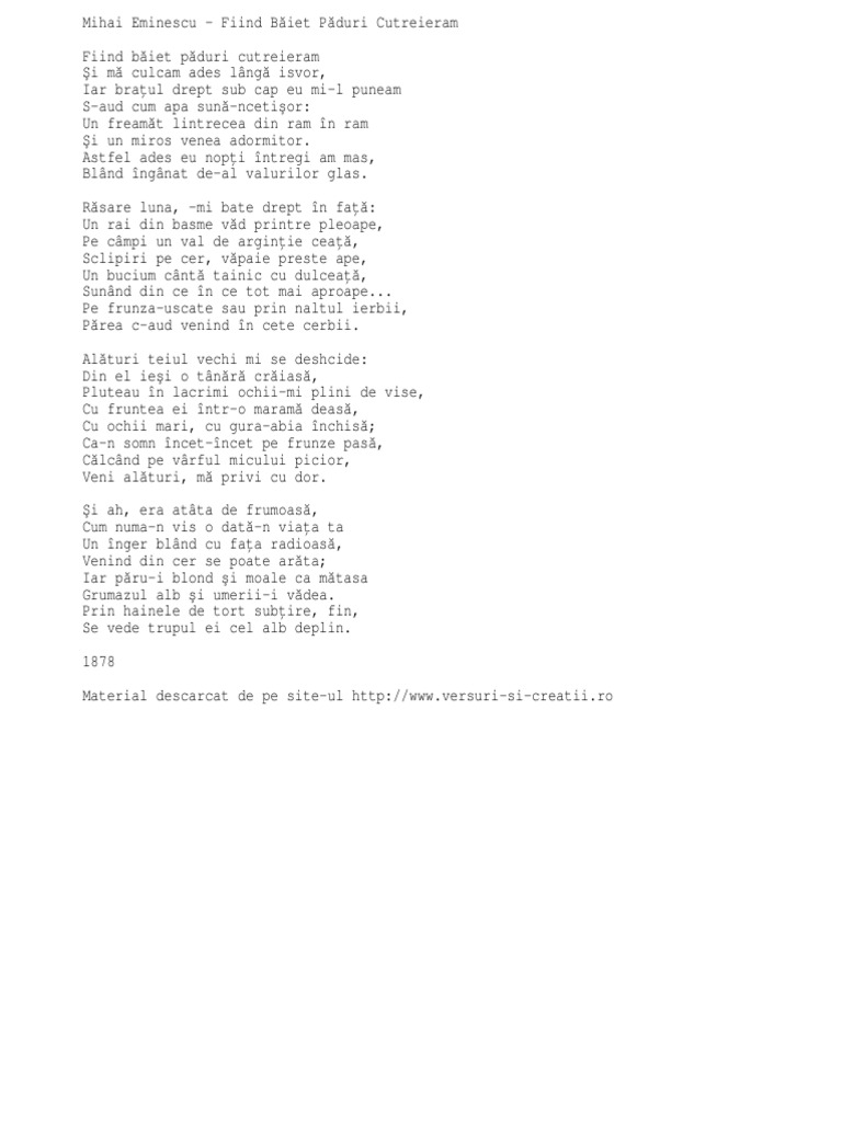 Versuri Poeziei Fiind Băiet Păduri Cutreieram De Mihai Eminescu