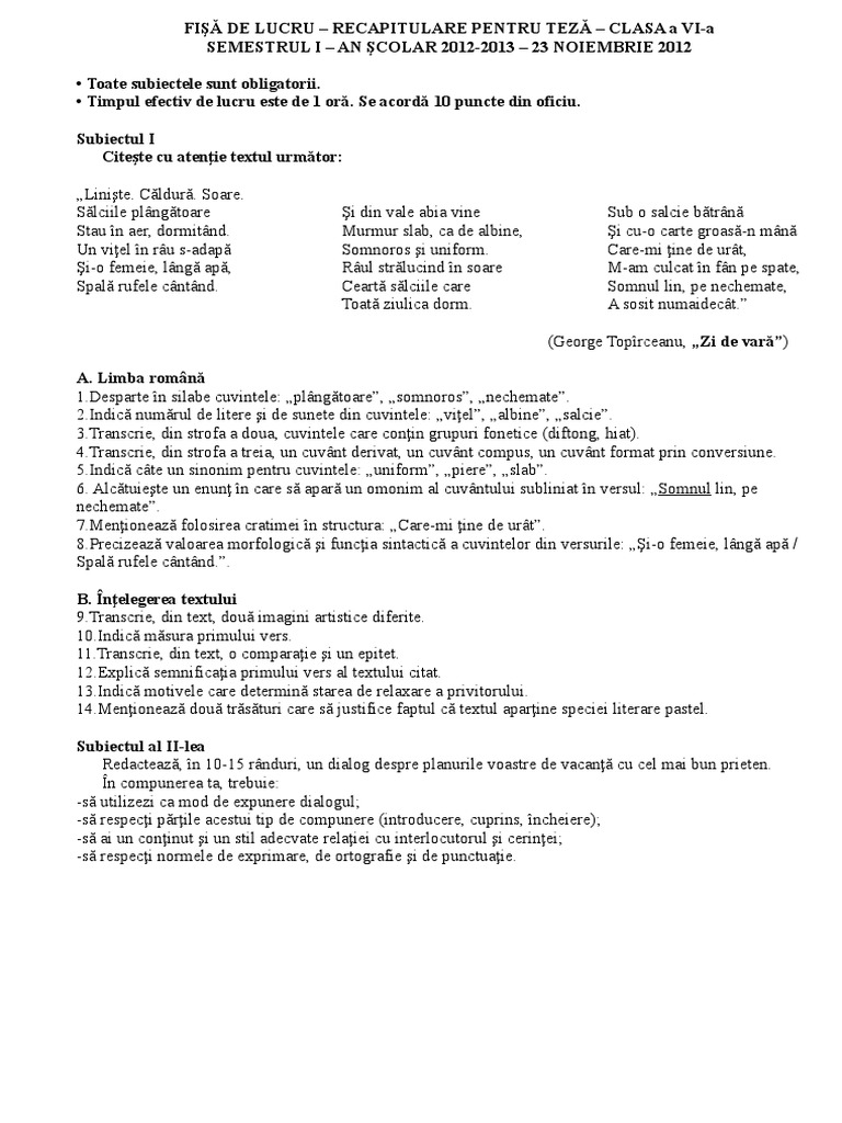 Fisă De Lucru 2 Pt Teză Cl 6